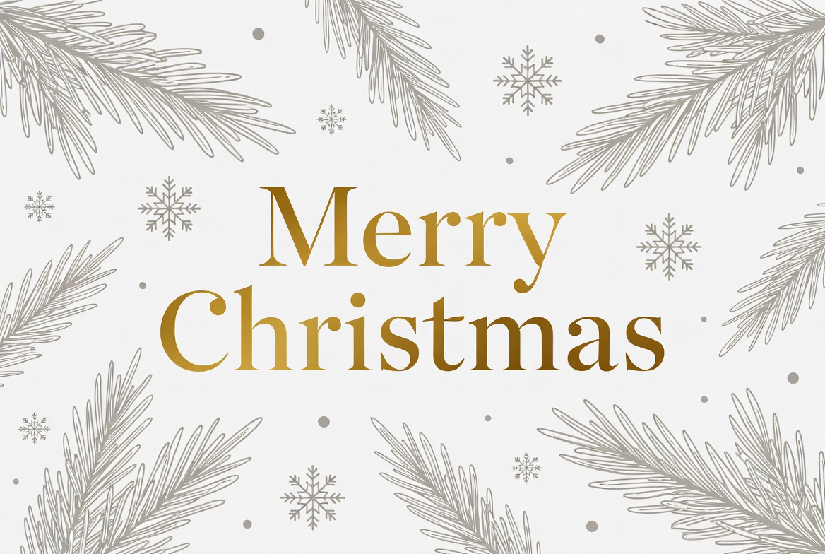 Christmas decoration, Christmas greeting, clipart, elegant lettering, festive design, fir branches, gold text, holiday card, illustration, seasonal graphic, silver accents, snowflakes, white background, winter theme, Merry Christmas