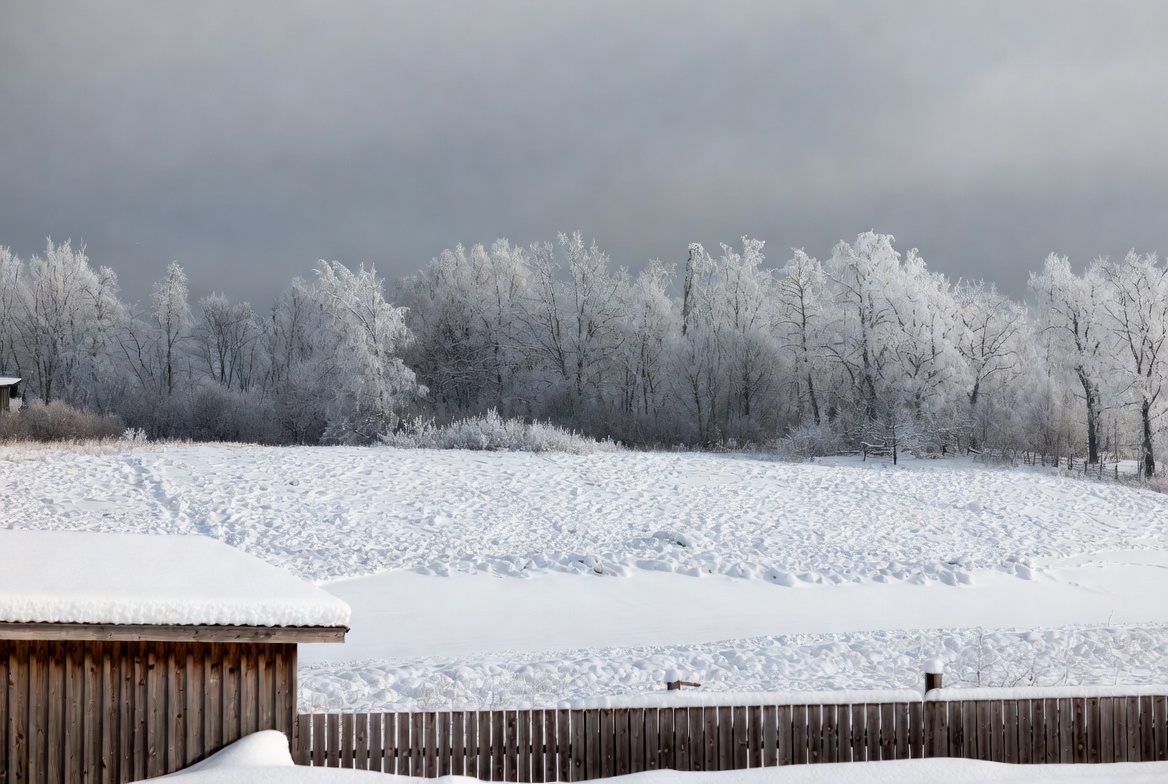 birch trees, cabin winter, cloudy sky, cold weather, fence snow, field snow, frosted trees, frozen trees, gray clouds, overcast sky, rural winter, snow, snow-covered roof, snowy field, tree line, white snow, winter scene, wooden cabin, wooden fence, winter landscape