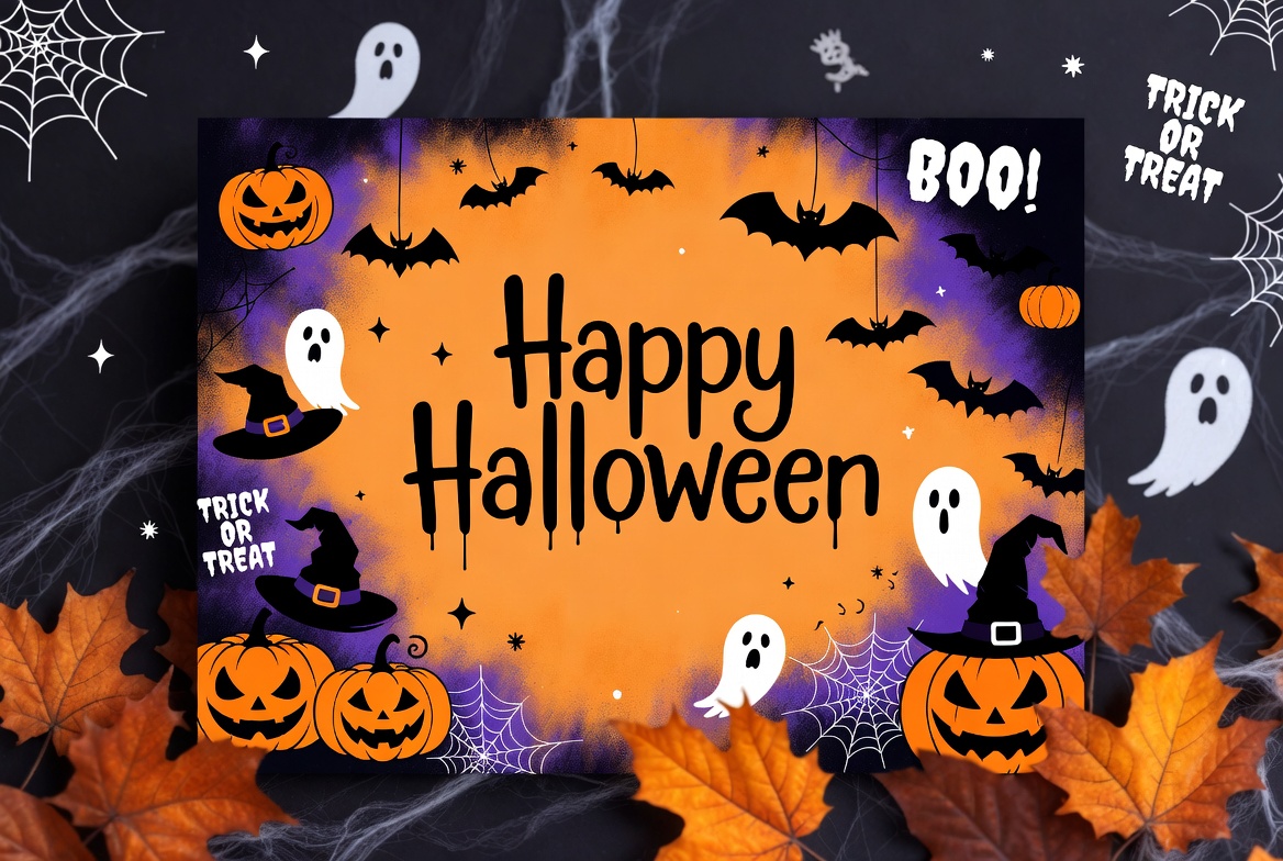 A vibrant Halloween illustration features bold orange text reading 'Happy Halloween' surrounded by carved pumpkins, flying bats, and floating ghosts. Spider webs, witch hats, and autumn leaves decorate the dark textured background. 'Trick or Treat' and 'Boo' accents add festive Halloween flair.