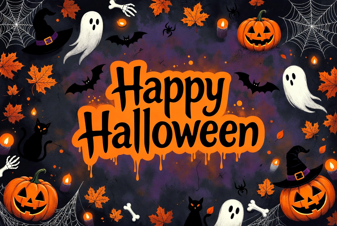 A vibrant Halloween illustration features bold orange 'Happy Halloween' text dripping with graffiti style. Surrounding elements include jack-o-lanterns, ghosts, bats, black cats, spider webs, bones, witch hats, autumn leaves, and candles on a dark purple background.