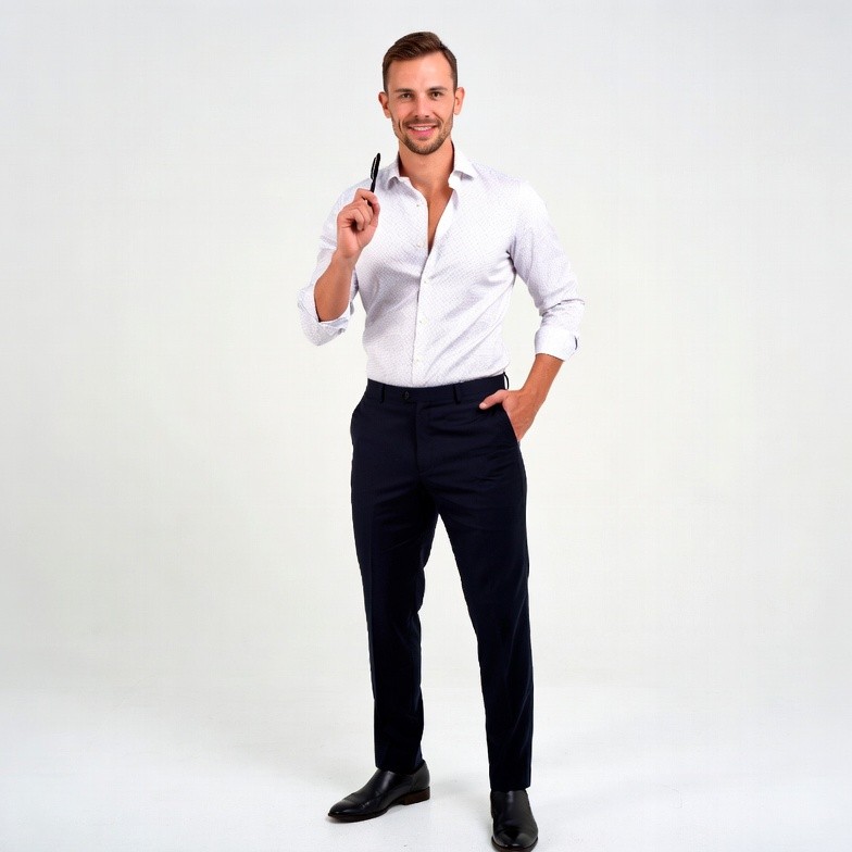 A young man with short brown hair smiles while holding a black pen up in his right hand. He wears an unbuttoned white dress shirt with the top buttons open and slim navy trousers. He stands confidently with one hand in his pocket against a plain white background.