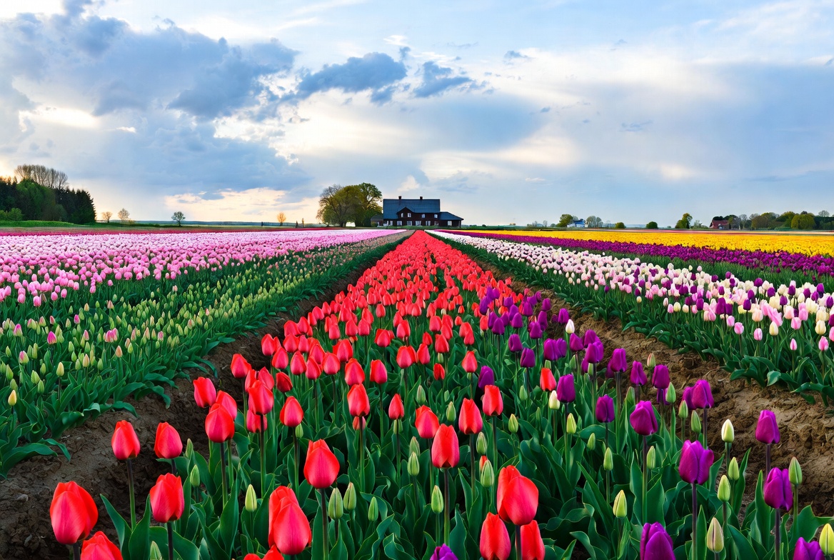 Dutch landscape, Netherlands tulips, agriculture, black barn, blooming flowers, cloudy sky, colorful tulips, field path, floral landscape, flower field, flower garden, flower rows, green leaves, pink tulips, purple tulips, red tulips, rural scenery, spring flowers, tulip farm, tulip fields, tulip plantation, vibrant colors, white tulips, wooden barn, yellow tulips, tulips