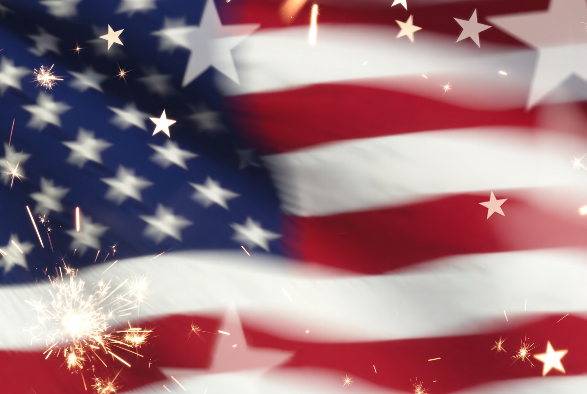 A vibrant American flag waves with red, white, and blue stripes and white stars. Golden fireworks explode across the flag, creating a sparkling patriotic display. The image features a blurred, dynamic motion effect on an isolated background.