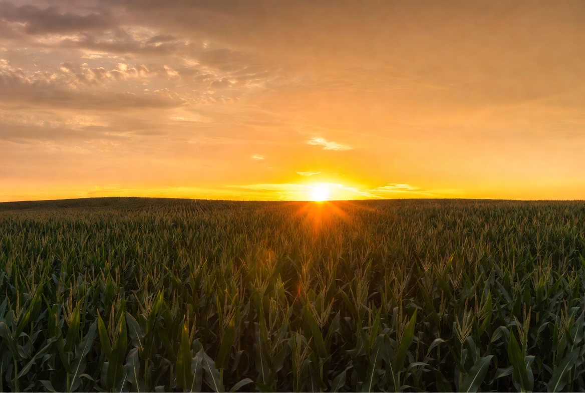 A vibrant sunset illuminates a vast cornfield with the sun low on the horizon. Golden orange skies with scattered clouds reflect over endless rows of green corn stalks. The sun's rays create a dramatic glow across the agricultural landscape.