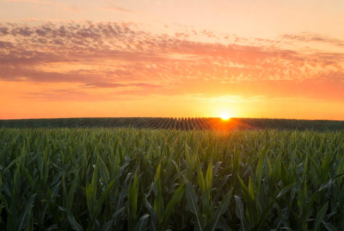 agriculture, clouds, corn, cornfield, crops, evening, farming, farmland, field, golden hour, green plants, harvest, horizon, landscape, maize, nature, orange sky, outdoors, rays, rural, scenery, sky, stalks, vibrant, warm light, sunset