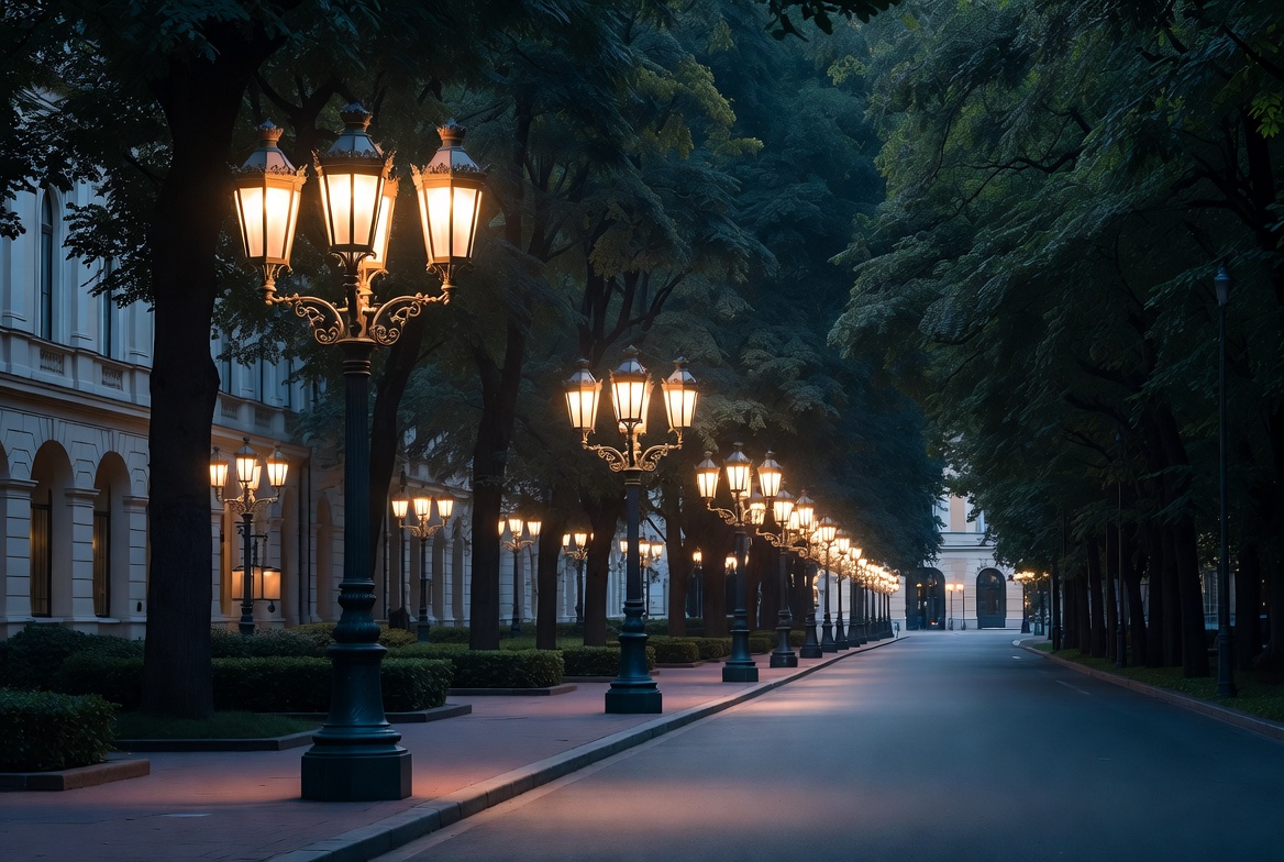 A paved street is lined with tall vintage street lamps emitting warm golden light at night. Dense green trees arch over the pathway, and elegant historic buildings with arched windows flank both sides. Neat hedges border the sidewalk leading to a distant lit archway.