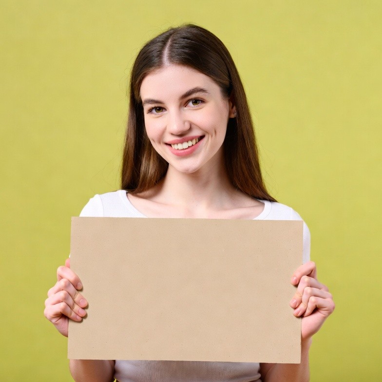 A young woman with long brown hair smiles at the camera while holding a large blank cardboard sign with both hands. She wears a white t-shirt and stands against a bright yellow background. Her expression is cheerful and engaging.