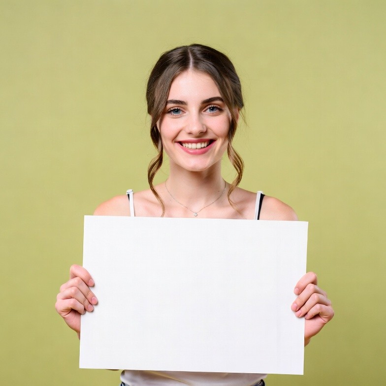 A young woman with long brown hair tied back smiles happily while holding a large white blank sign in front of her. She wears a white tank top and stands against a bright green background. Her blue eyes are bright and she grips the sign with both hands.