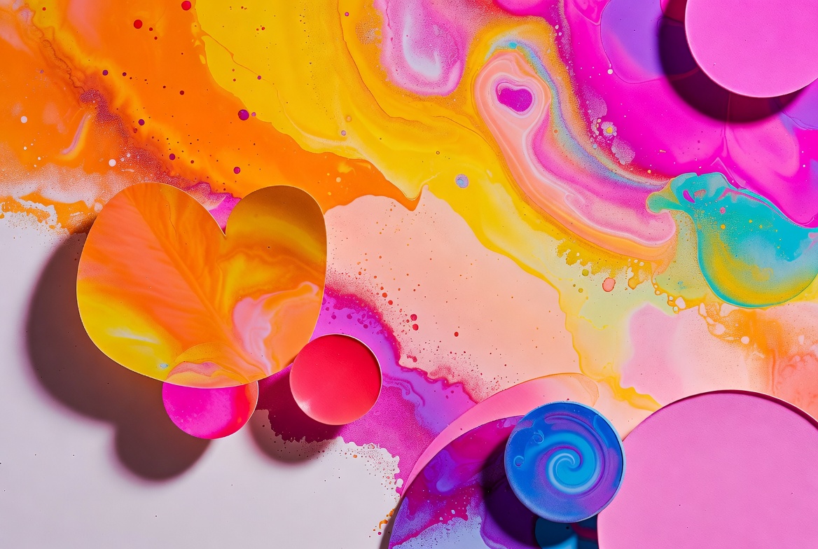 acrylic paint, art texture, artistic background, blue circles, circular forms, colorful abstract, creative design, digital illustration, dynamic abstract, fluid art, glossy paint, heart shape, layered paint, modern art, neon colors, ombre effect, orange swirls, paint blobs, paint drips, pink paint, pour painting, rainbow paint, swirling patterns, vibrant colors, white background, yellow hues, abstract art
