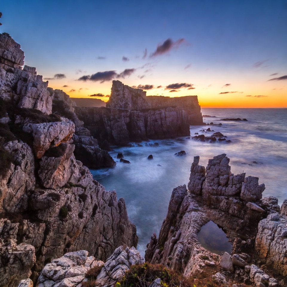 blue sky, clouds, coastline, crashing waves, landscape, natural arch, nature, ocean, orange sky, rocks, rocky shore, rugged cliffs, sea, seascape, sky, stone arch, sunset, twilight, waves, cliffs