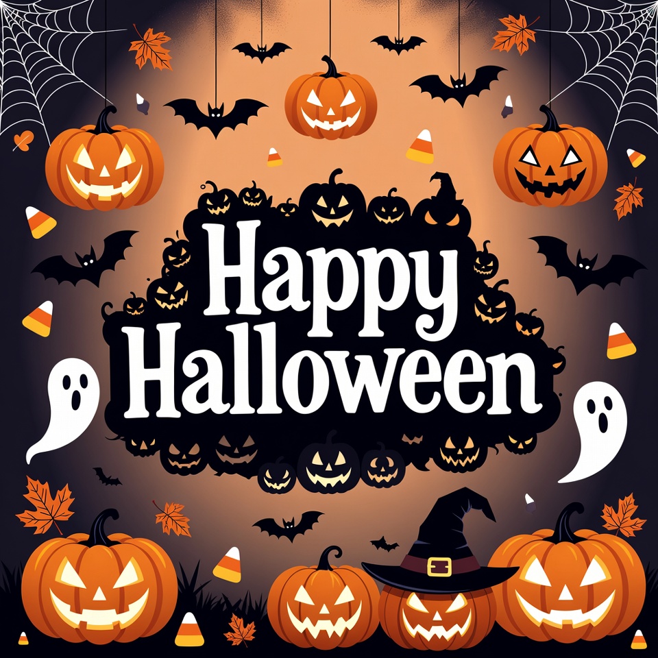 A vibrant Halloween illustration features a large 'Happy Halloween' text in bold black letters surrounded by carved pumpkins, bats, ghosts, spider webs, candy corn, and fall leaves. Jack-o'-lanterns with glowing faces and a witch hat are scattered around the design on a dark orange gradient background. The festive graphic elements create a spooky yet celebratory atmosphere.