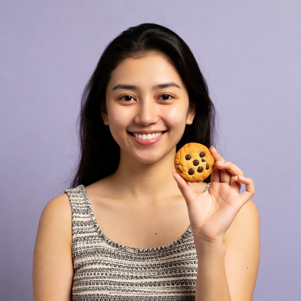 A young Asian woman with long black hair smiles while holding a chocolate chip cookie in her hand. She wears a striped tank top and stands against a solid purple background. Her eyes are almond-shaped and she appears happy.