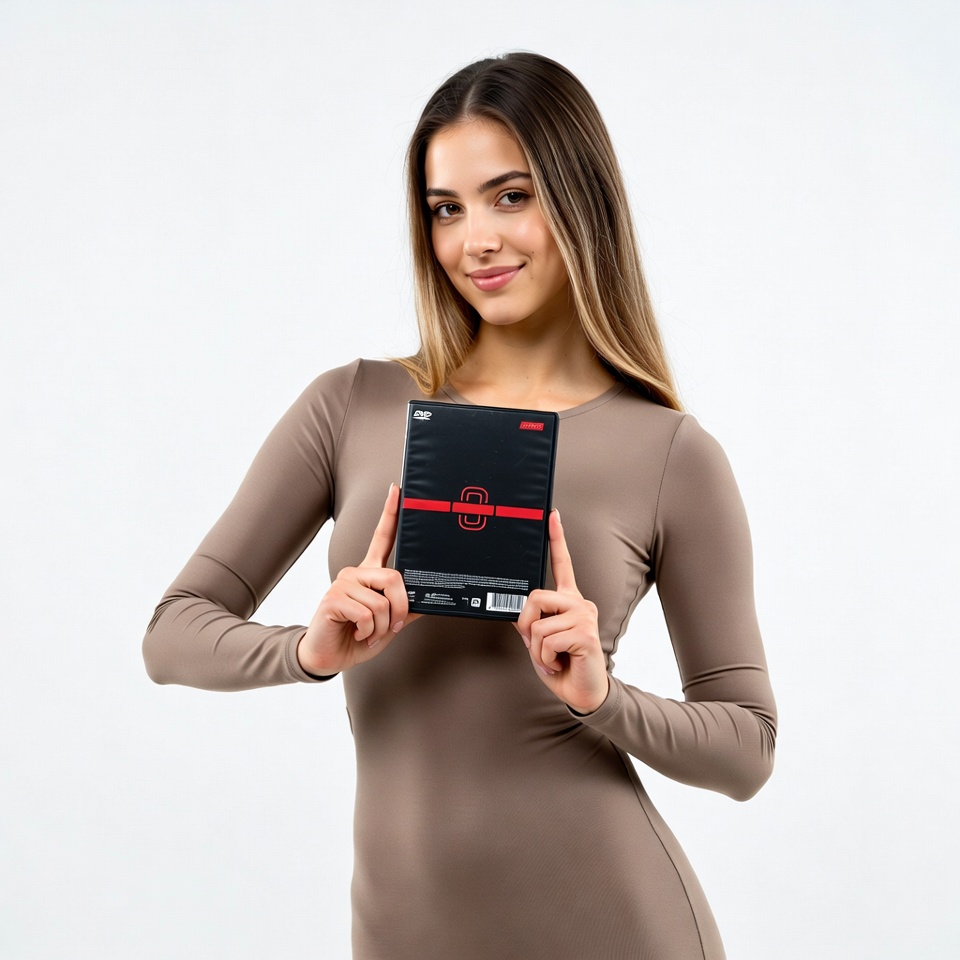 A young woman with long blonde hair smiles while holding a black rectangular box with red accents in front of a white background. She wears a form-fitting beige long-sleeve dress. Her hands grip the box firmly at chest level.
