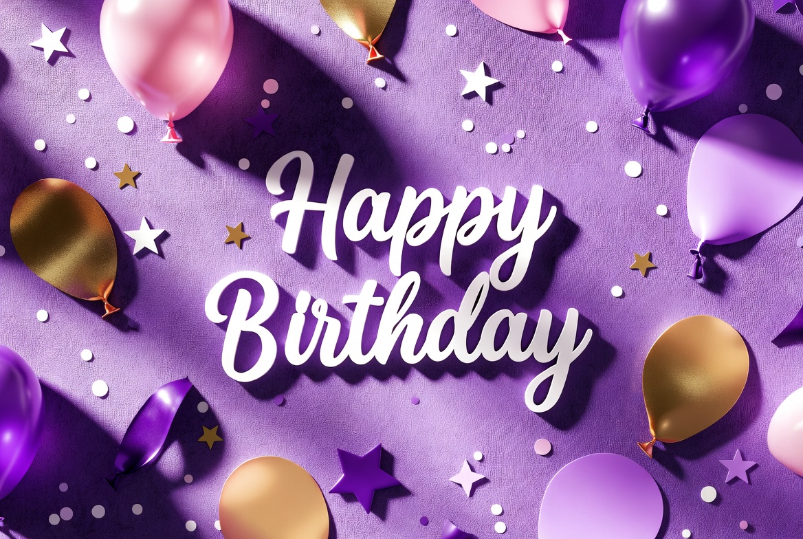 balloons, birthday, card, celebration, confetti, festive, flat lay, gold balloons, golden stars, greeting, holiday, invitation, party, pink balloons, purple background, purple balloons, script font, shadows, stars, text, happy birthday