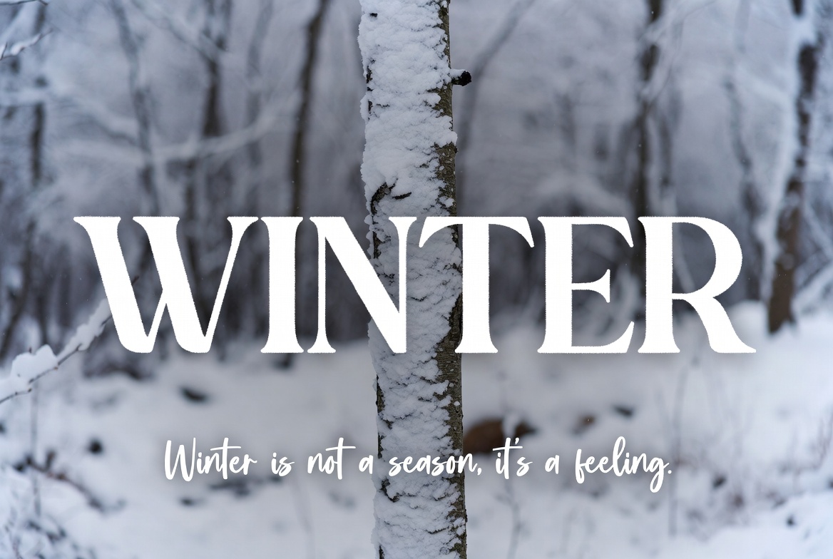 A snowy forest scene features snow-covered trees with bold white text reading 'WINTER' centered prominently. Below the text, the quote 'Winter is not a season, it's a feeling' appears in elegant white script. The background showcases a serene winter landscape with grayish-blue tones and fresh snow.