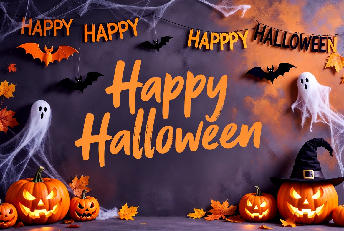A festive Halloween display features large orange 'Happy Halloween' text in the center. Jack-o-lantern pumpkins, black bats, white ghosts, spider webs, and orange leaves decorate the dark smoky background. A black witch hat sits among the pumpkins on the foreground surface.