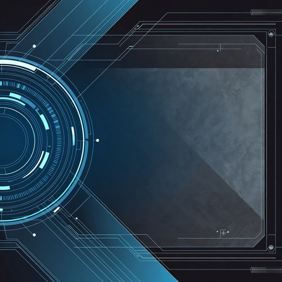 A digital abstract background features glowing cyan circuit lines and patterns on a dark backdrop. Central circular elements with neon blue rings and grid structures create a high-tech cyber effect. Transparent overlays and angular frames enhance the futuristic design.