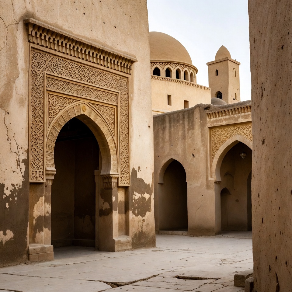 Islamic, Middle Eastern, North African, adobe architecture, ancient building, arches, beige walls, courtyard, dome, doorway, geometric patterns, isolated background, minaret, mud-brick, ornate carvings, traditional, weathered stone, mosque