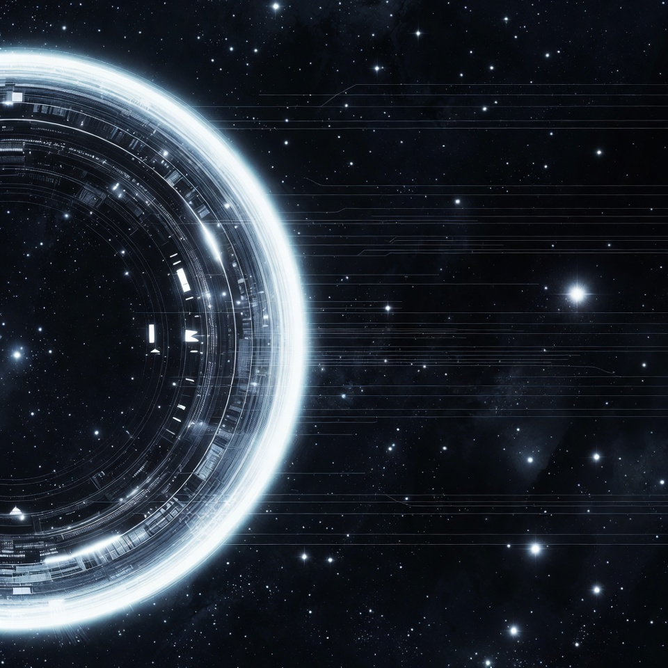 A large, glowing circular ring with intricate mechanical structures floats in a starry space background. The ring emits a bright white-blue light and features detailed circuit-like patterns. Surrounding stars and nebulae enhance the cosmic sci-fi atmosphere.