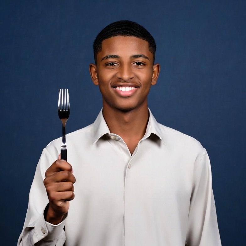 A young African-American man with short hair smiles while holding a silver fork in his right hand. He wears a light-colored button-up shirt with the top buttons undone. The image is set against a solid blue background.