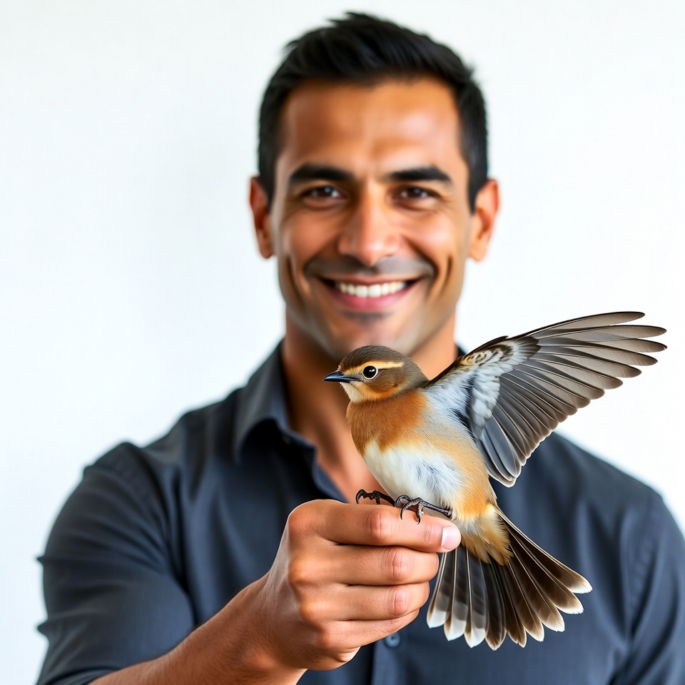 Middle Eastern, avian, bird wings, birdwatching, collared shirt, dark hair, feathers, flying bird, gray shirt, hand holding, happy expression, holding bird, isolated background, nature, orange bird, portrait, robin bird, short hair, small bird, smiling man, white background, wildlife, man