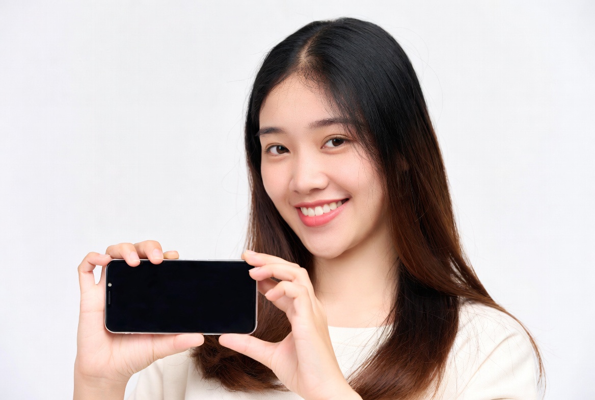 A young Asian woman with long straight black hair smiles while holding a blank smartphone with both hands in front of her. She wears a light-colored top and stands against a plain white background. Her expression is cheerful and engaging.