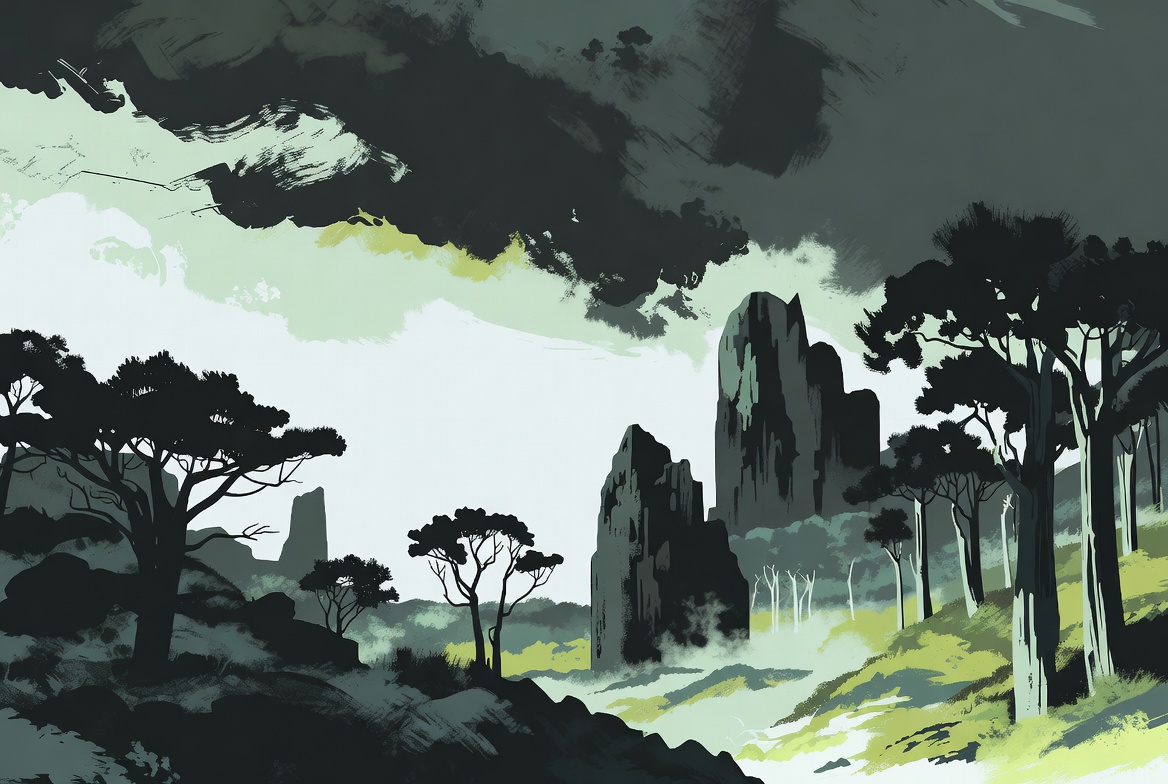 A digital illustration features dark silhouettes of tall pine trees and jagged rock formations against a stormy sky. The scene includes a winding path through grassy terrain with layered foreground and background elements. Shades of green, gray, and yellow create depth in the isolated landscape.