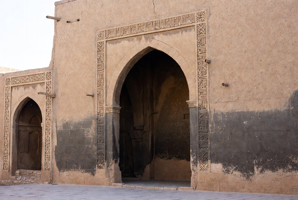 Arabic script, Middle Eastern architecture, adobe structure, ancient ruins, arched doorway, arched portal, architectural detail, beige walls, clay walls, cultural heritage, desert building, detailed molding, doorway entrance, eroded facade, geometric patterns, heritage site, historical site, intricate carvings, mud bricks, old fort, ornate frame, outdoor arch, rustic building, sandy ground, stone arch, traditional arch, vacant archway, weathered walls, mud architecture