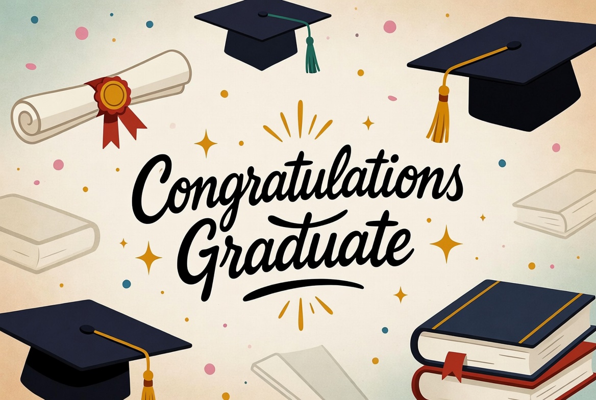 Colorful illustration features 'Congratulations Graduate' text surrounded by graduation caps, diplomas, and stacked books. Tassels hang from black mortarboards, and stars add sparkle on a gradient background. Elements are arranged in a festive, isolated composition.