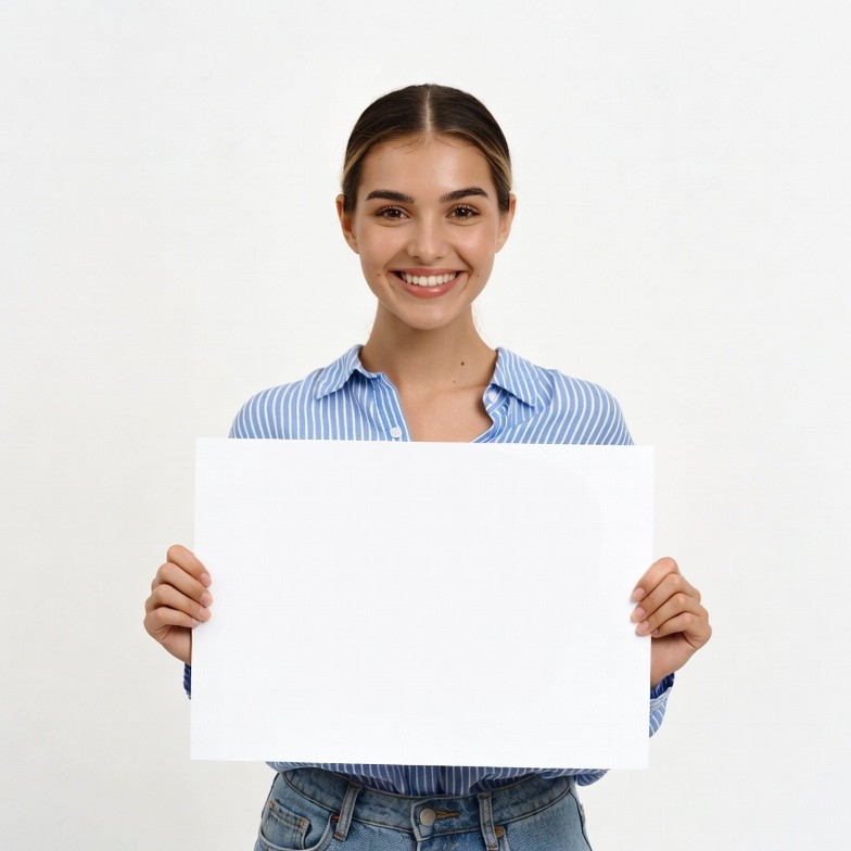 A young woman with long dark hair tied in a ponytail smiles happily at the camera while holding a large white blank sign in front of her chest. She wears a light blue button-up collared shirt and blue jeans, standing against a plain white background. Her expression is cheerful and engaging.