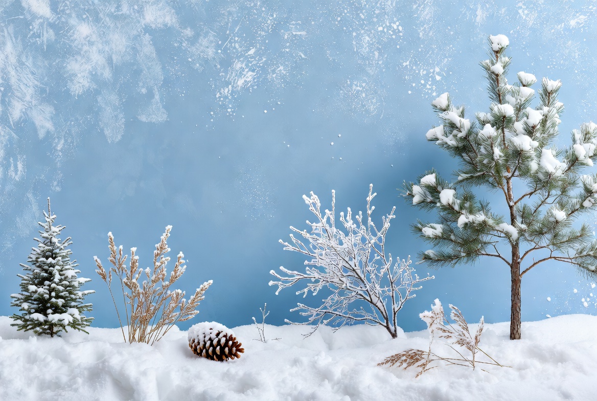 Christmas decor, Christmas trees, blue background, blue sky background, dry grass, evergreen trees, falling snow, festive winter, fir trees, frosted bushes, holiday elements, holiday plants, natural elements, pine branches, pine forest, pine trees, snow covered trees, snow scene, snowflakes, snowy landscape, snowy pine cone, white snow, winter decoration, winter plants, winter scene, pine cone