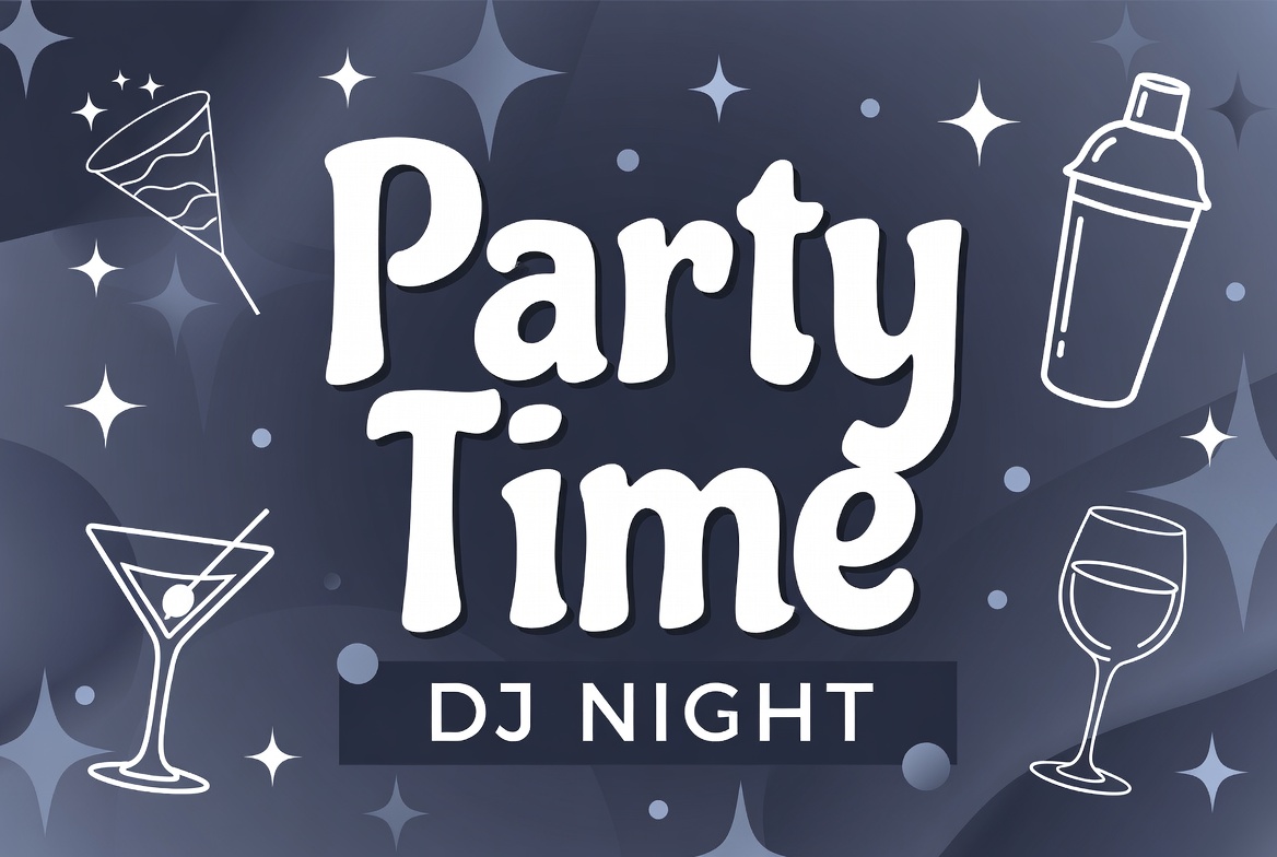 A vibrant clipart illustration features the bold text 'Party Time' and 'DJ Night' on a dark starry background. White line drawings of party hats, cocktail shakers, martini glasses, and wine glasses surround the text. Sparkles and gradient effects add a festive nightclub atmosphere.