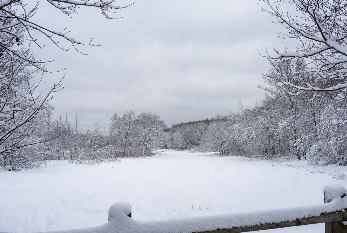 bare trees, cloudy sky, cold weather, forest path, frozen woods, nature trail, snow covered trees, snow scene, snowy field, snowy path, tree branches, white snow, winter landscape, wooden fence, winter forest