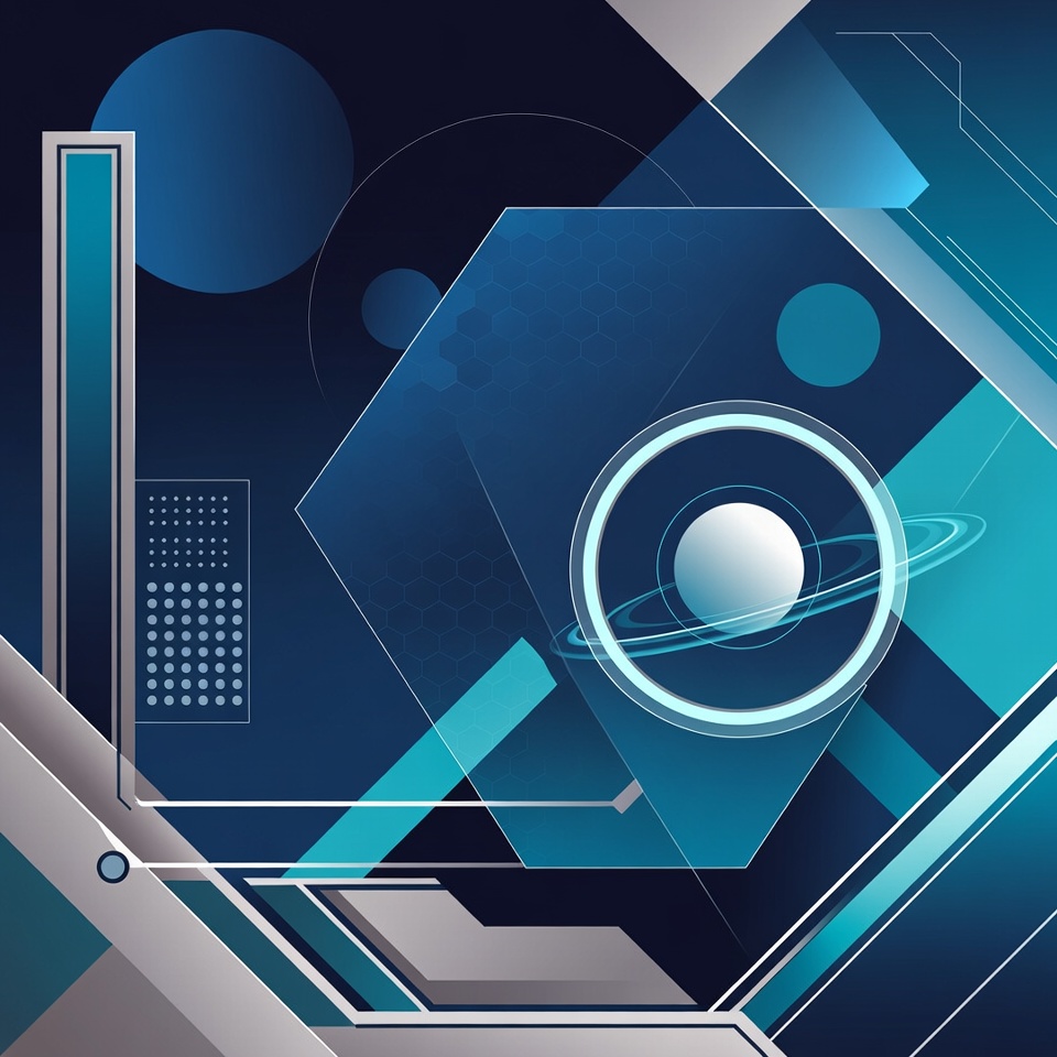 An abstract digital illustration features overlapping geometric shapes in shades of blue and white. Central elements include a glowing ringed planet, hexagonal frames, and circular orbs on a dark navy background. Grid patterns and angular lines add a futuristic, sci-fi aesthetic.