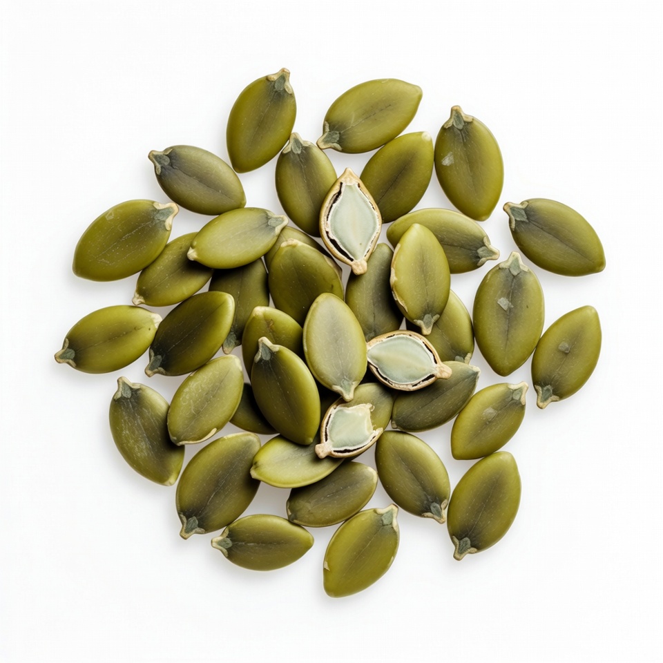 A pile of green pumpkin seeds is arranged in a circular pattern on a white background. Some seeds are split open, revealing white interiors. The seeds have smooth, shiny shells.
