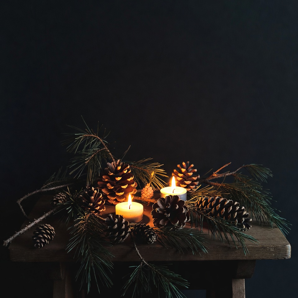 Christmas decoration, candlelight, candles, cozy setup, dark background, evergreen branches, festive centerpiece, flame glow, holiday arrangement, holiday still life, lit candles, natural pine, pine branches, pine twigs, rustic table, warm glow, white candles, winter decor, wooden table, pine cones