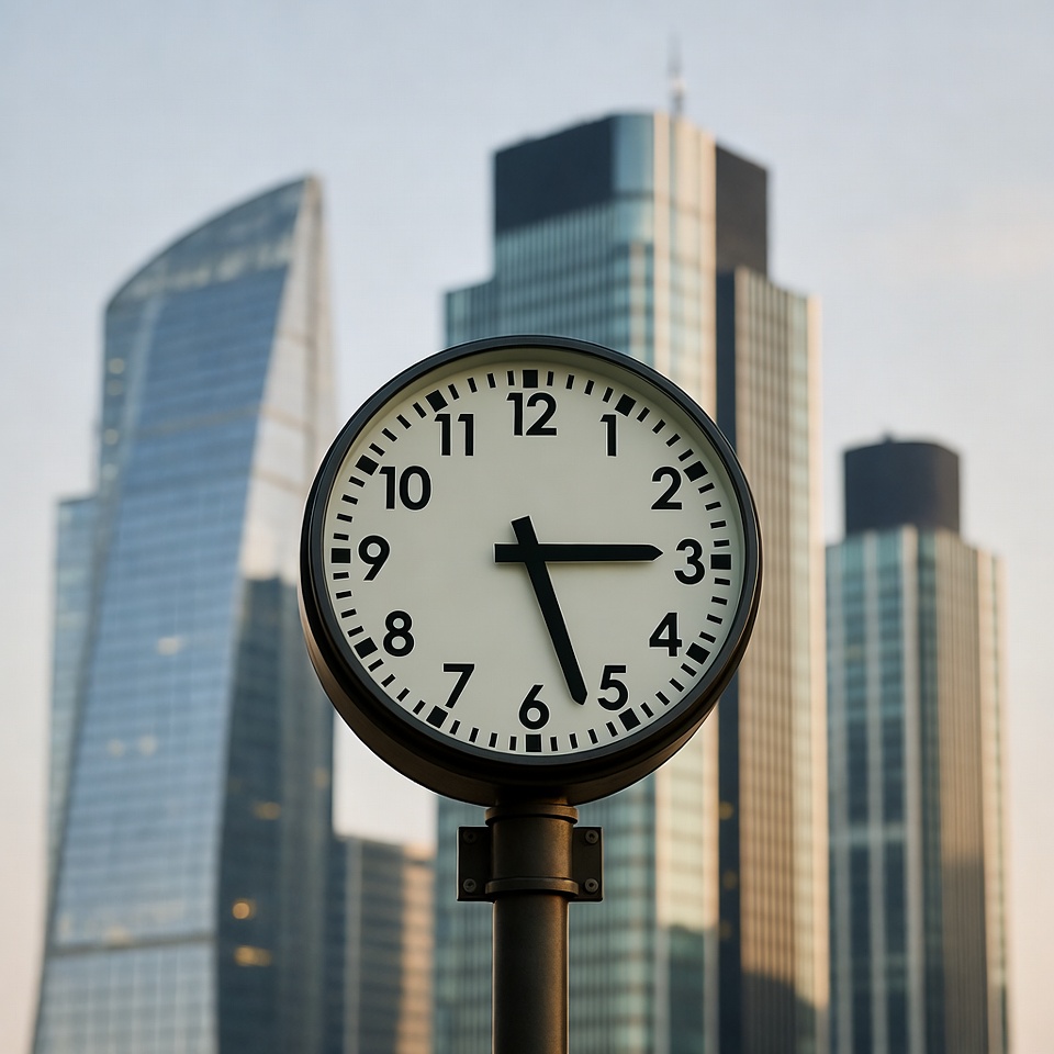 A large analog clock displays 11:20 against a backdrop of modern glass skyscrapers. The clock face is white with black numbers and hands, mounted on a black metal pole. Tall buildings with blue and black hues rise prominently behind it under a clear sky.