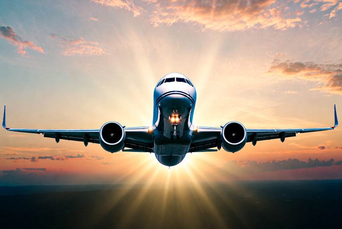 A commercial airplane flies directly toward the camera amidst a vibrant orange and pink sunset sky. Sunlight beams radiate from behind the aircraft, highlighting its white fuselage, blue wings, and jet engines. Scattered clouds and a distant horizon complete the scenic aerial view.
