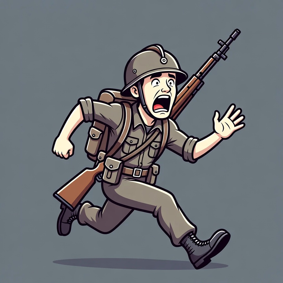 A cartoon illustration depicts a frightened soldier running forward with a scared expression. He wears a World War-era uniform, helmet, backpack, and carries a rifle slung over his shoulder. His mouth is open wide in fear, one hand raised, against a plain gray background.