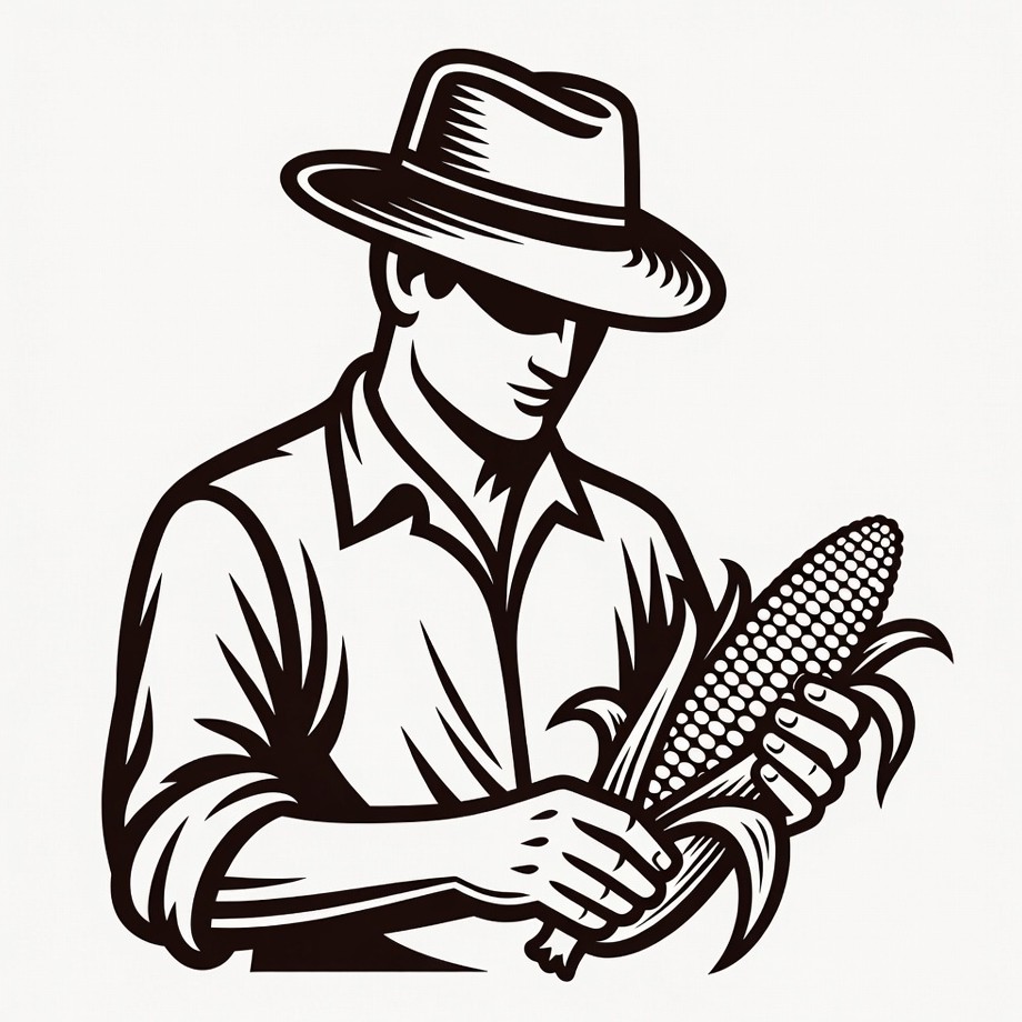 A black and white line art illustration depicts a man wearing a wide-brimmed hat and collared shirt. He holds a large corn cob in his hands, viewed from the side on an isolated white background. The style is a detailed woodcut engraving.
