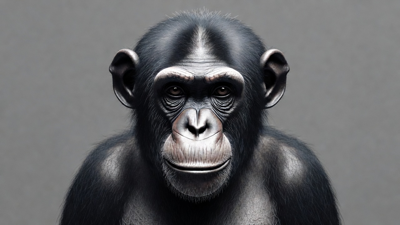 animal, ape, black fur, chimp, close-up, ears, face, gray background, mammal, monkey, portrait, primate, red eyes, smiling, teeth, wildlife, chimpanzee