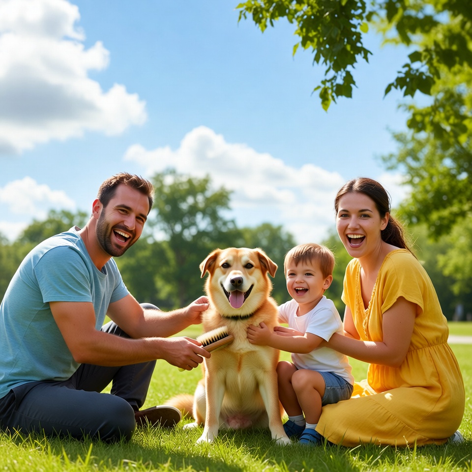 A smiling White family kneels on green grass in a sunny park, brushing their happy golden retriever dog. The father grooms the dog's chest with a brush while the mother and toddler son assist joyfully. Lush green trees and blue sky form the background.
