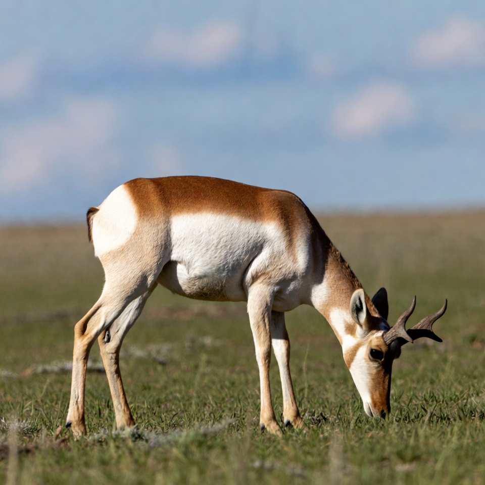 animal, antelope, blue sky, clouds, curved horns, field, grass, grazing, horns, mammal, nature, outdoors, prairie, side view, slender legs, tan fur, white rump, wild animal, wildlife, pronghorn