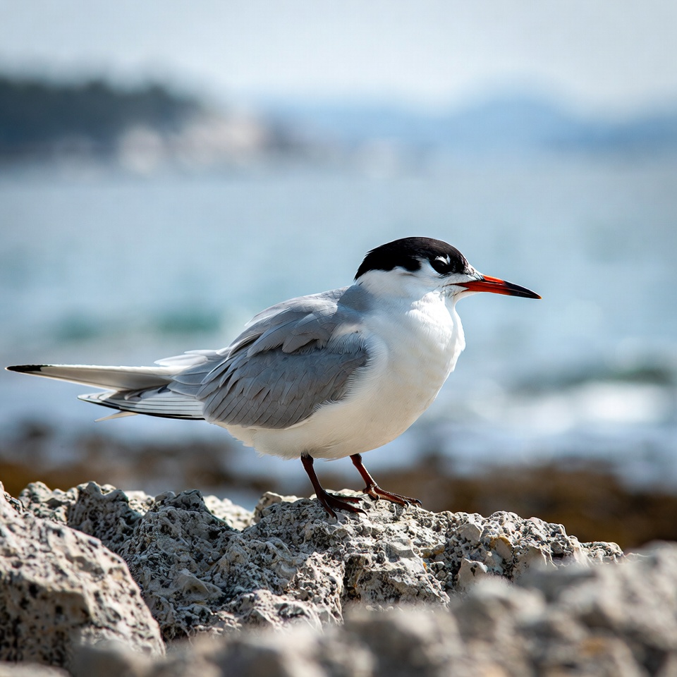 beach, bird, black cap, blue sky, buildings, coast, gray wings, mountains, nature, ocean, outdoor, red bill, rocks, rocky outcrop, sea bird, seaside, shorebird, standing bird, tern, water, white bird, wildlife, gull-billed tern