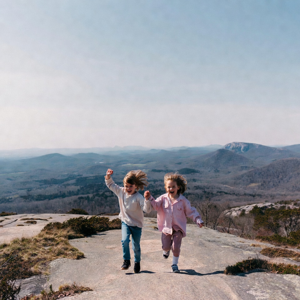 A young boy in a light gray sweater and jeans holds hands with a girl in a pink outfit as they run joyfully on a rocky mountain summit. They have long, wind-swept blonde hair and arms raised in excitement. Behind them stretches a vast panoramic view of rolling hills, distant mountains, and a clear blue sky.