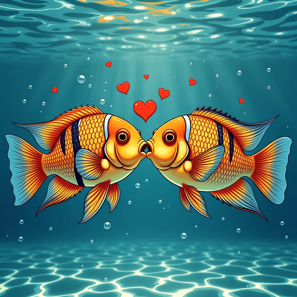 Nemo fish, aquarium fish, blue water, bubbles, cartoon fish, clipart, fish, fish couple, floating hearts, hearts, illustration, kissing fish, loving fish, marine life, ocean, orange fish, red hearts, sea animals, striped fish, two fish, underwater, vector art, clownfish