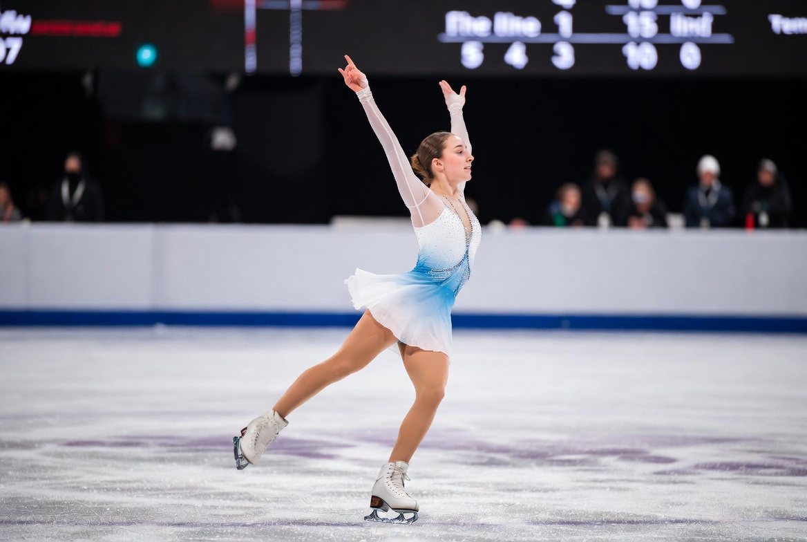 A young woman in a white and blue figure skating dress performs a dynamic spin on the ice rink. She raises both arms high with one leg extended behind her, wearing white skates. A scoreboard and blurred audience appear in the background.