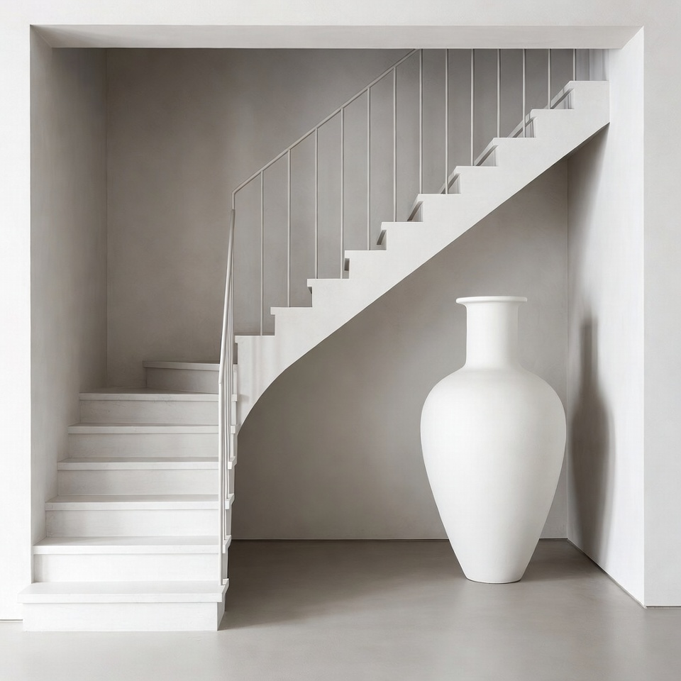 White Spiral Staircase with Large Vase