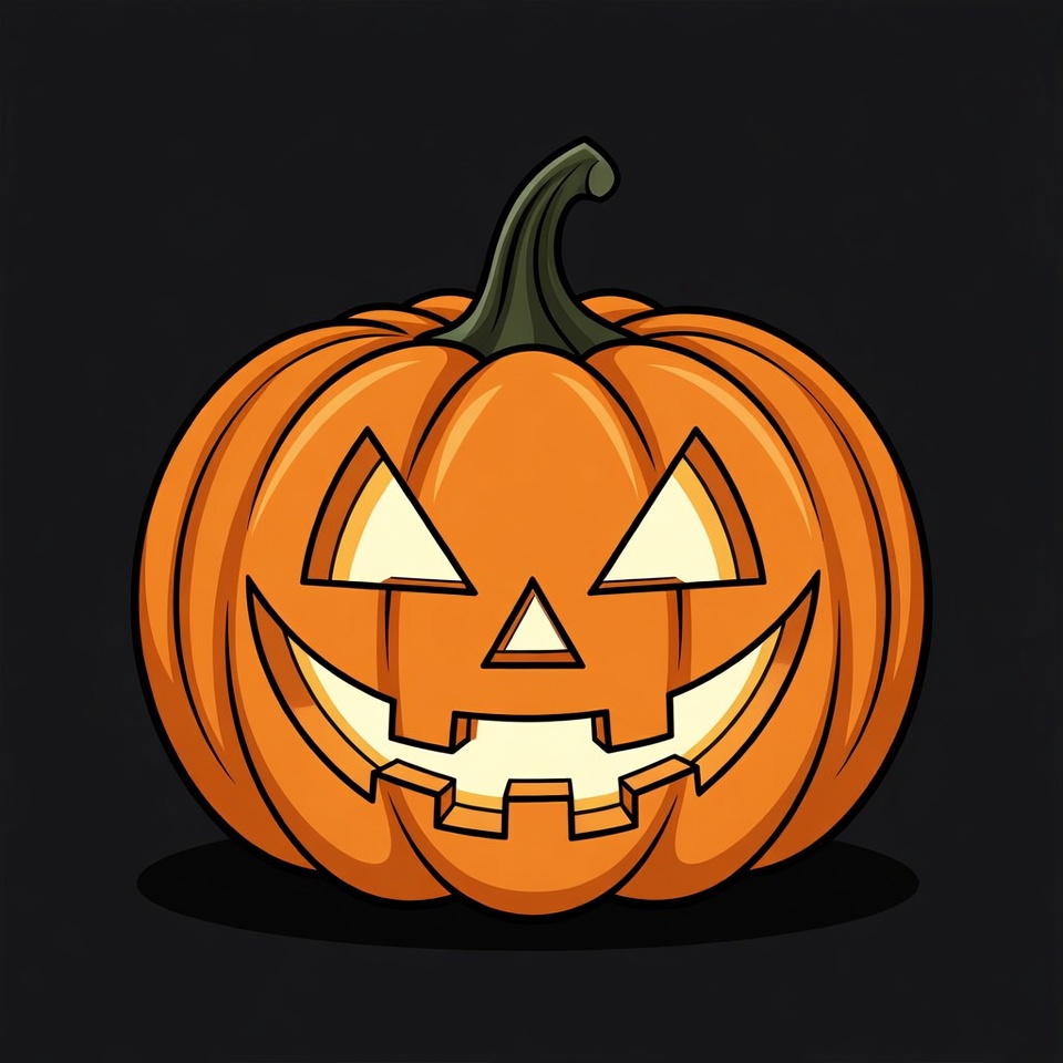 A vibrant orange jack-o-lantern pumpkin with glowing triangular eyes, nose, and jagged smiling mouth is centered on a black background. The pumpkin features a green stem on top and smooth curved ridges. It is a colorful illustration with bright white light shining from the carved facial features.