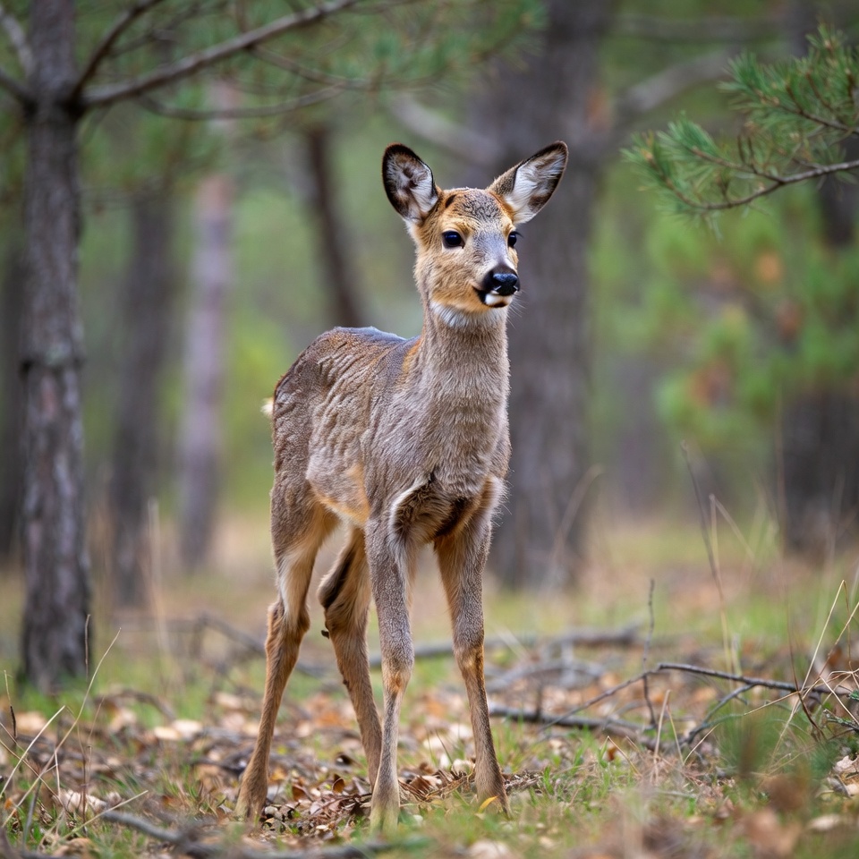 A young roe deer stands in a dense pine forest with green trees and fallen leaves on the ground. The fawn has large ears, a light brown coat, and a black nose, gazing forward. Sunlight filters through the branches, highlighting its slender legs and alert posture.